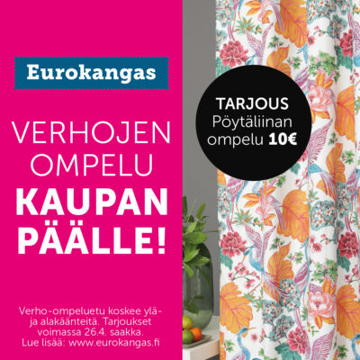 Eurokangas tarjoaa nyt kankaan ostajalle suorien sivuverhojen ylä- ja alakäänteiden ompelun kaupan päälle. Ihastu uutuuksiin tai luota klassikoihin!