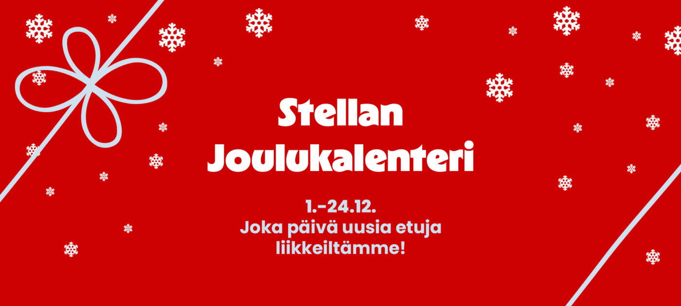 Stellan joulukalenterista löydät joka päivä 1.-24.12. uuden huikean edun. Kalenterin luukut aukeavat etukäteen luukkua edeltävänä iltana klo 18 – voit siis tutustua päivittäin vaihtuviin etuihin jo niitä edeltävänä iltana!