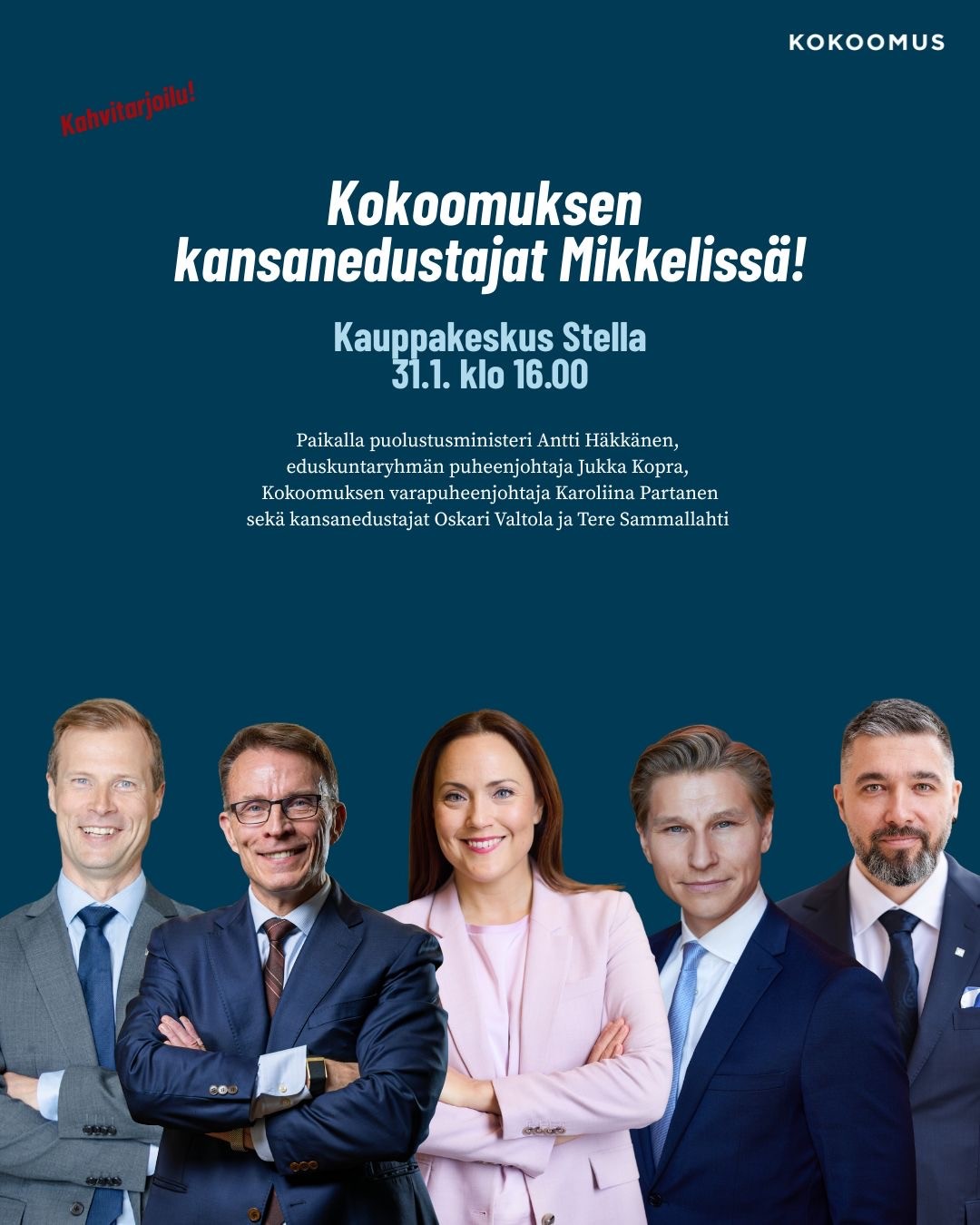Kokoomuksen kansanedustajat Tähtitorilla la 31.1. klo 16