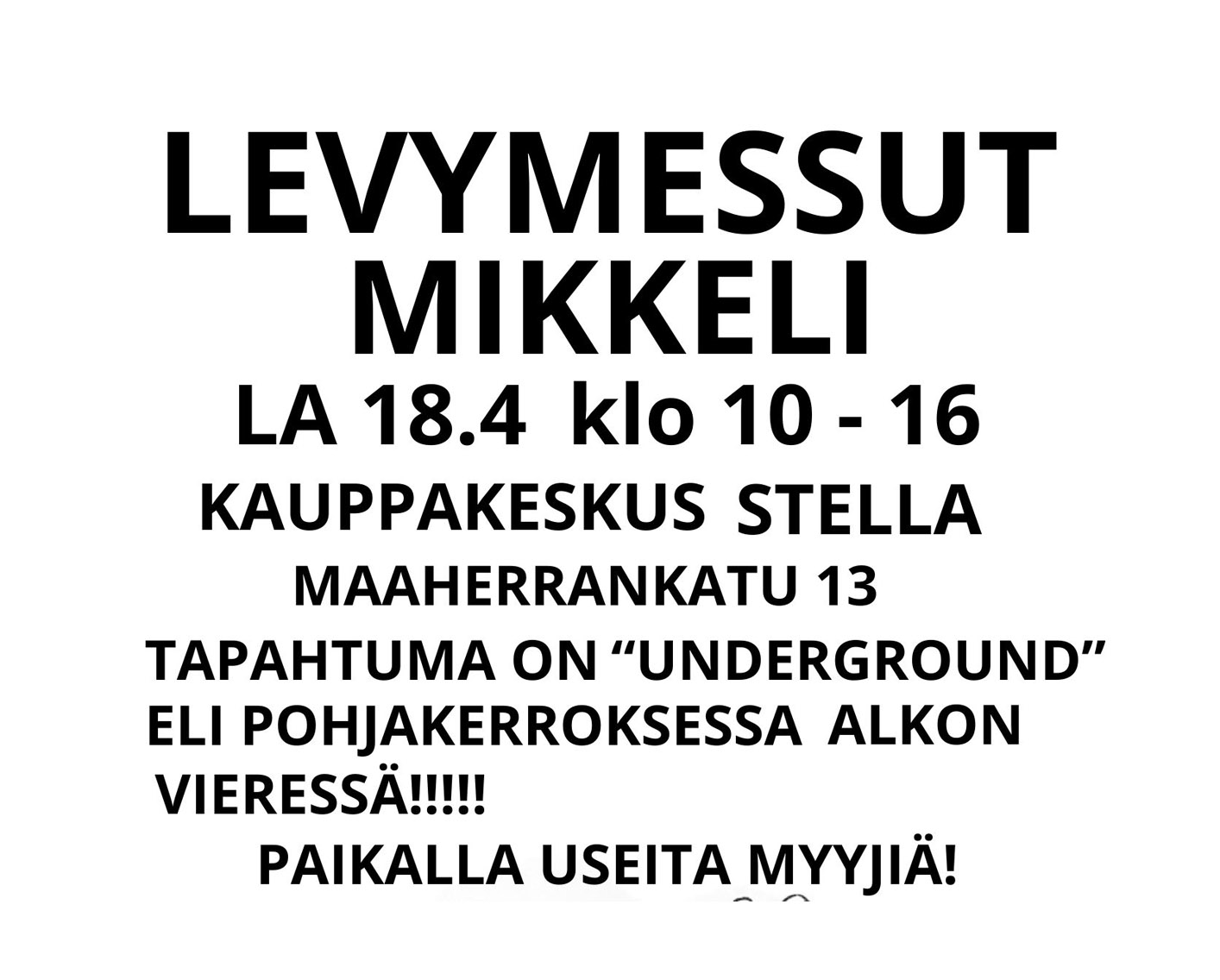 Levymessut18.04. 10:00 - 16:00« Mikkelin LevymessutVeteraaniviikon perhepäivä: Pikku Papun Orkesteri ja Liisa Kallio: livepiirtokonsertti »Levymessut Alkon viereisessä pop up tilassa la 18.4. klo 10-16Paikalla myös ostetaan levyjä!