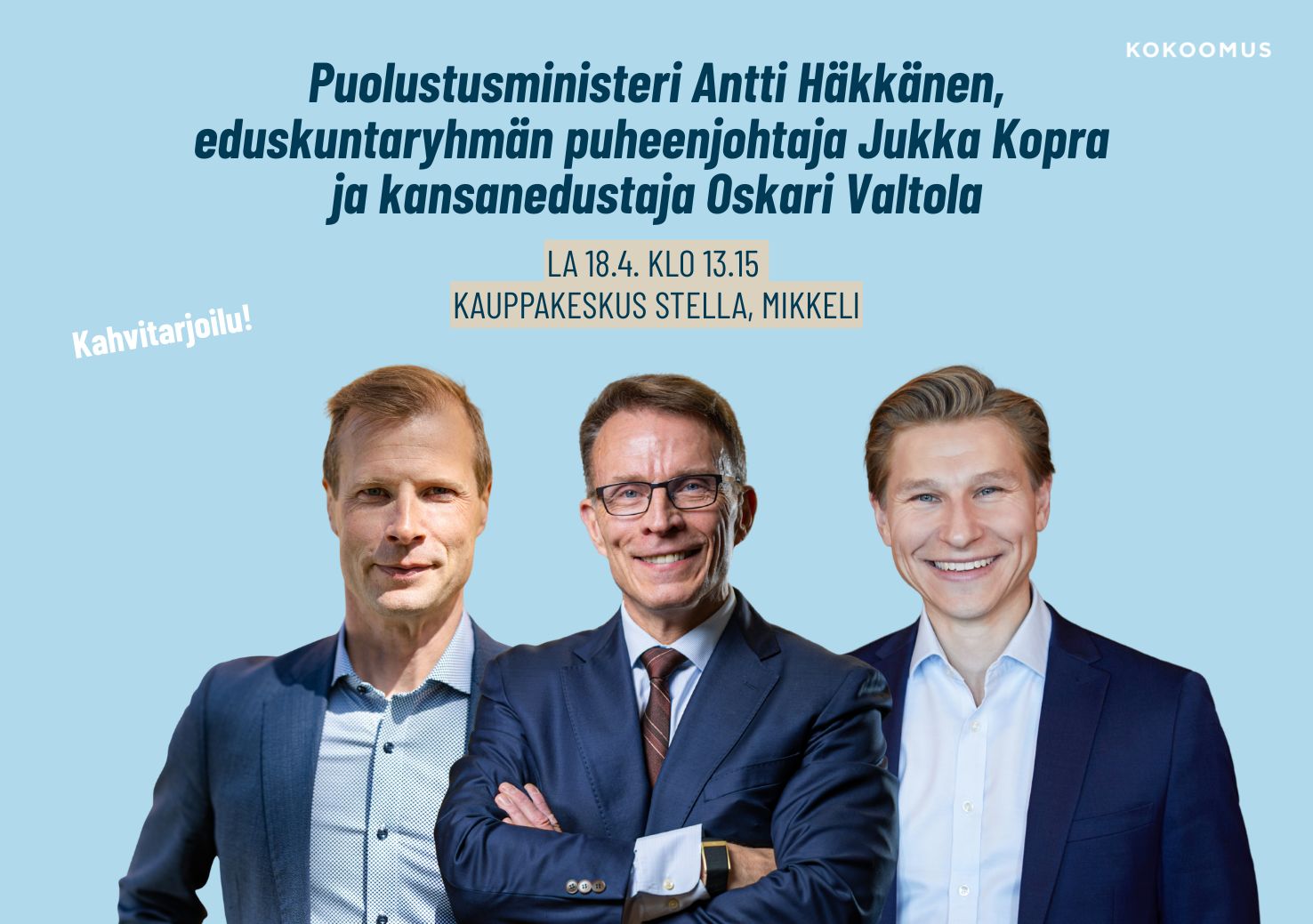 Puolustusministeri Antti Häkkänen, eduskuntaryhmän puheenjohtaja Jukka Kopra ja kansanedustaja Oskari Valtola Tähtitorilla la 18.4. klo 13.15